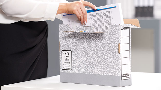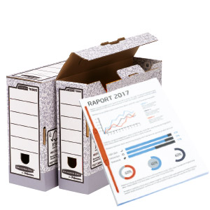 Nasze doświadczenie pozwoliło dodać do nich jeszcze dwie - szybkość składania i dbałość o środowisko naturalne. Dzięki systemowi FastFold® złożenie pudła to teraz tylko kilka sekund. Wszystkie nasze produkty do archiwizacji zostały wykonane z materiałów pochodzących z odzysku oraz nadających się w 100% do ponownego przetworzenia.