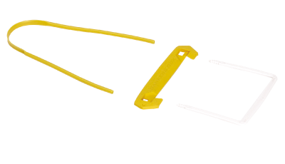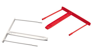 Dwuczęściowy, plastikowy klips archiwizacyjny umożliwiający przechowywanie dokumentów w pudełkach na akta.
