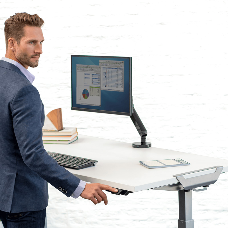 Zmieniaj wysokość biurka korzystając z intuicyjnego panelu wyposażonego w oznaczenia LED i 4 zapamiętywane ustawienia wysokości.