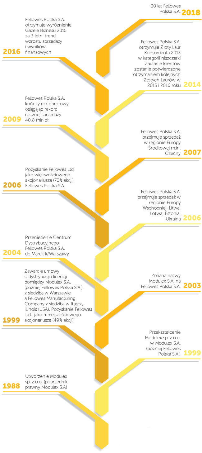 Na rynku polskim produkty Fellowesa można kupić już od 1992 r. Od samego początku ich dystrybutorem była firma Modulex. Pierwszym produktem, który został sprowadzony były filtry komputerowe, później asortyment stopniowo był rozszerzony. W grudniu 1999 roku w wyniku umowy zawartej pomiędzy Modulexem i Fellowes UK został utworzony polski oddział tej międzynarodowej firmy. Obecnie Centrum Dystrybucyjne i Serwis znajduje się w Markach koło Warszawy.