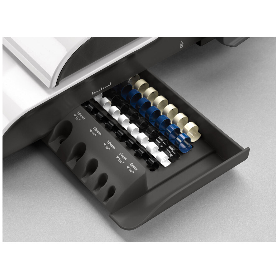 - Ergonomiczna. Specjalna, osobna szuflada do przechowywania grzbietów z opatentowanym systemem mierzenia grubości dokumentów i doboru odpowiedniego grzbietu.