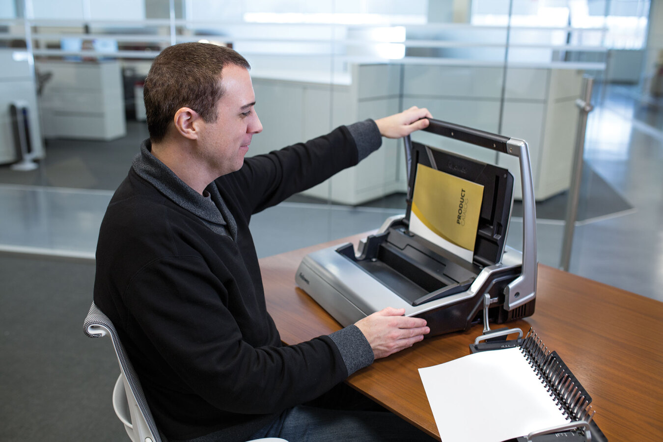 - Szybka oprawa dużej ilości dokumentów - System Satellite®. Wyjmowana kaseta z platformą bindującą umożliwia pracę 2 osobom jednocześnie.