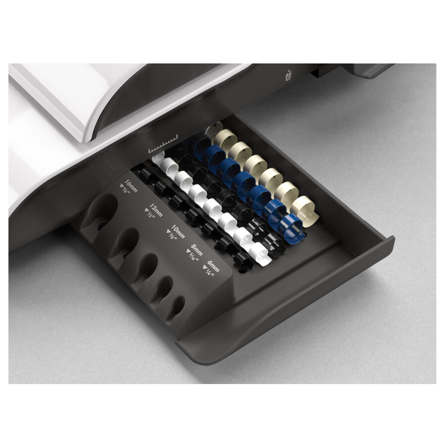 - Ergonomiczna. Specjalna, osobna szuflada do przechowywania grzbietów z opatentowanym systemem mierzenia grubości dokumentów i doboru odpowiedniego grzbietu.