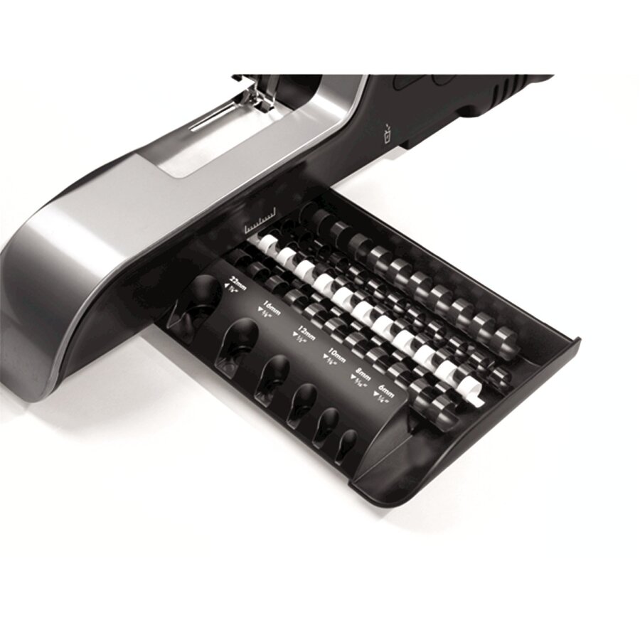 - Ergonomiczna. Specjalna, osobna szuflada do przechowywania grzbietów z opatentowanym systemem mierzenia grubości dokumentów i doboru odpowiedniego grzbietu