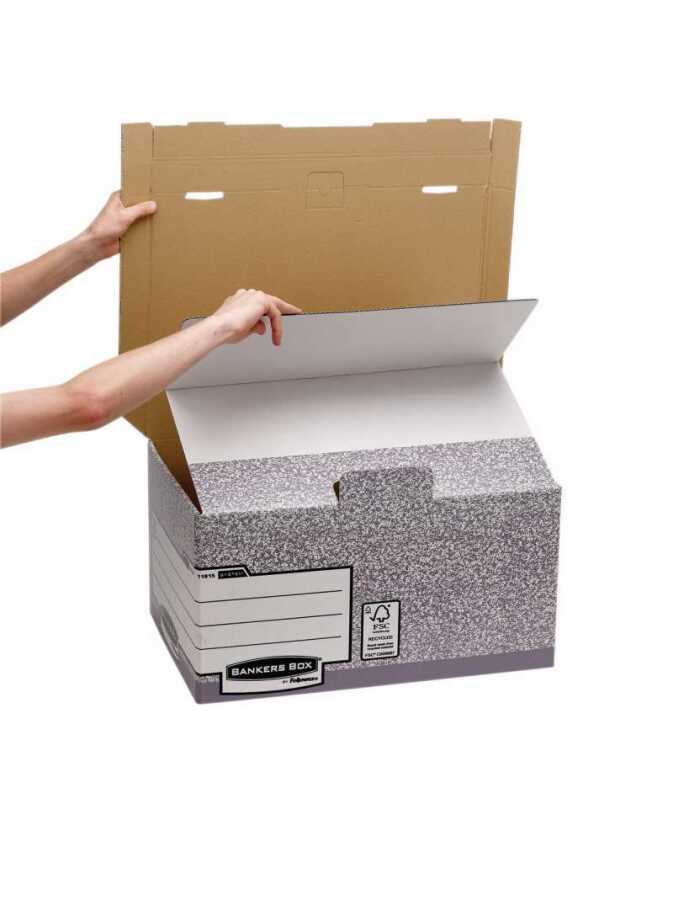 Duże, praktyczne pudło do przechowywania pudełek i pojemników z aktami, segregatorów i innych dokumentów nieaktywnych.