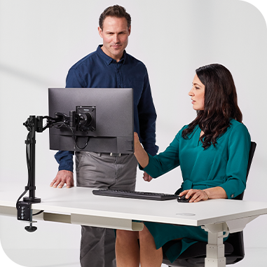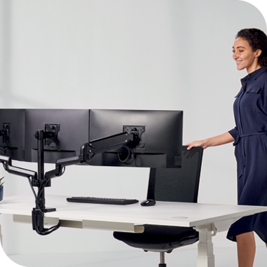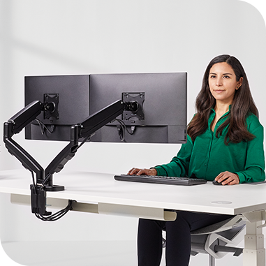 Kompaktowe i stabilne w pełni regulowane ramiona na jeden lub dwa monitory. Pomagają wygospodarować przestrzeń do pracy i zorganizować okablowanie przy biurku.