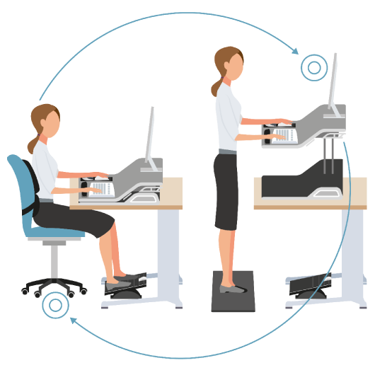 Unikaj długotrwałego przebywania w nieruchomej pozycji siedzącej i długiego stania. Pomiędzy siedzeniem a staniem pracuj aktywnie i ciesz się: zdrowym ruchem, utratą kalorii, zwiększoną wydajnością, dbałością o zdrowie i dobre samopoczucie. Zalecany optymalny cykl: 45 minut w pozycji siedzącej 15 w pozycji stojącej, 5 minut przerwy.